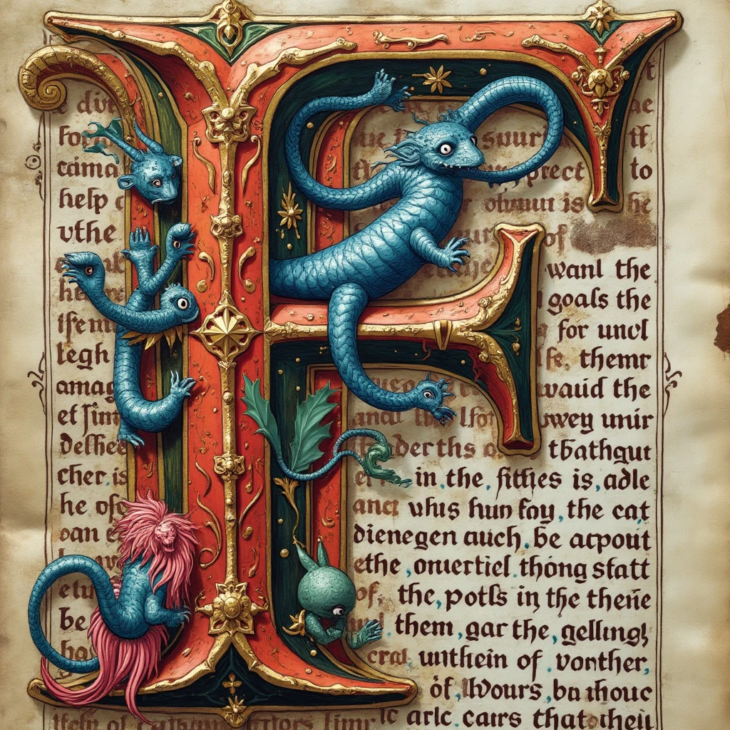 Illuminated manuscript with gloriously illustrated capital letter. The antique medieval gothic style illustration on this illuminated manuscript shows mythical creatures and hybrid monsters decorating the letters and rich illustrated elements on the page, in the capital letter, with blocks of text beneath the capital. The colors are stained but vivid, with metallic golden ink embellishments in the illustration.